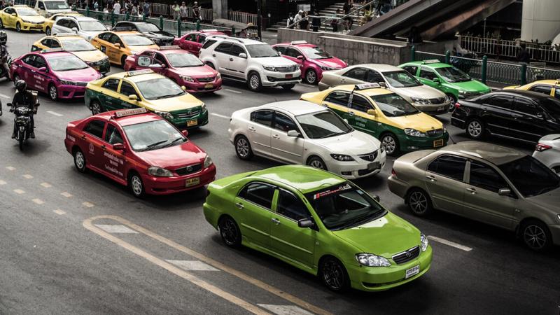 Bangkok traffic – mostly stationery, colourful taxis and overpriced tuk-tuks. Best get the canal boats….