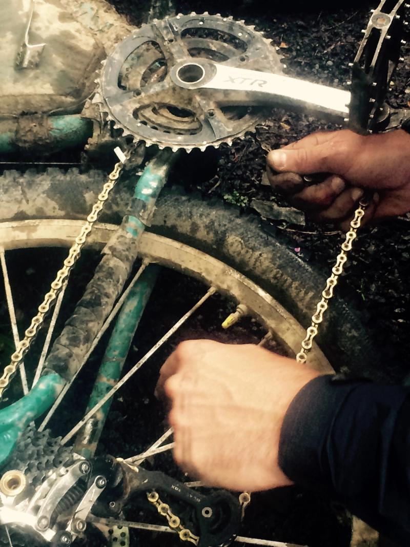 We did have a couple of “breaks” on the way up.. A sheared front-mech cage (a swanky XTR mech breaking in a way it really shouldn’t), and a mile later a broken chain..