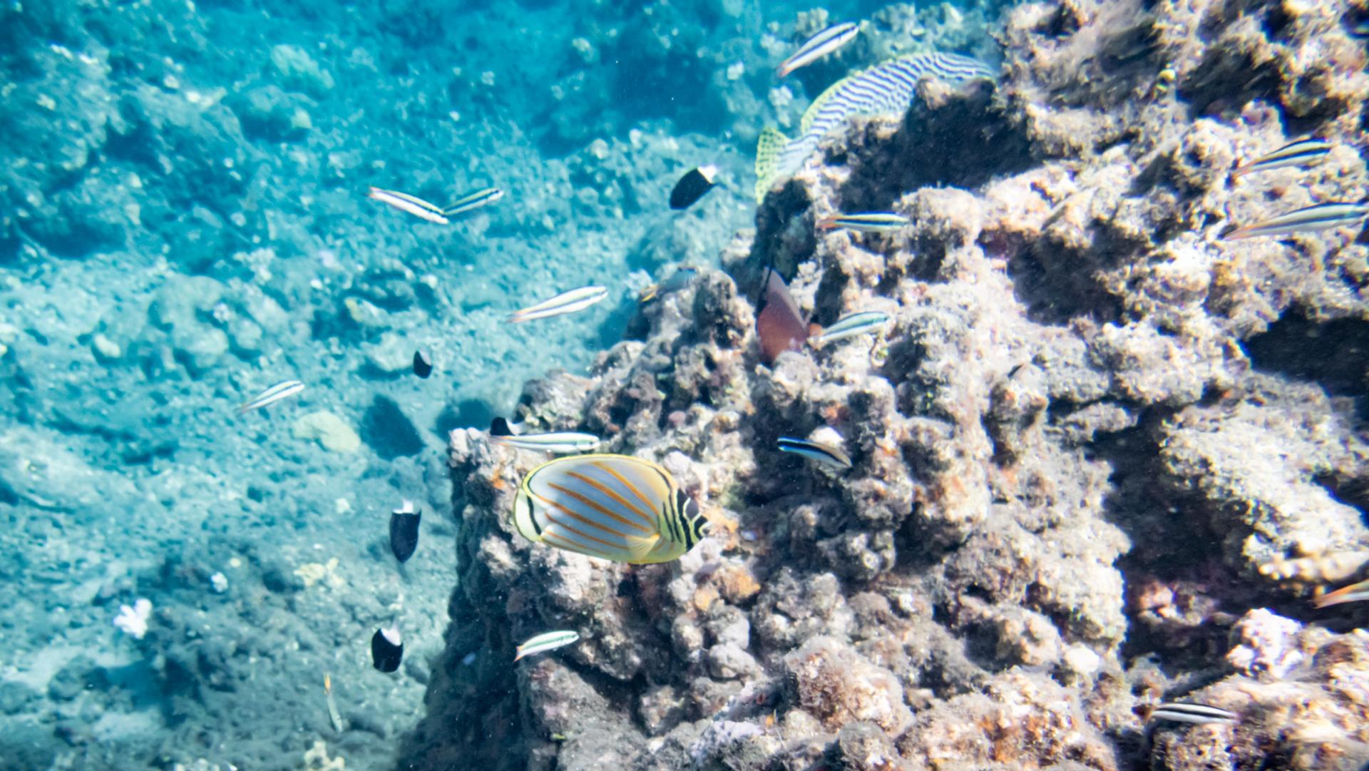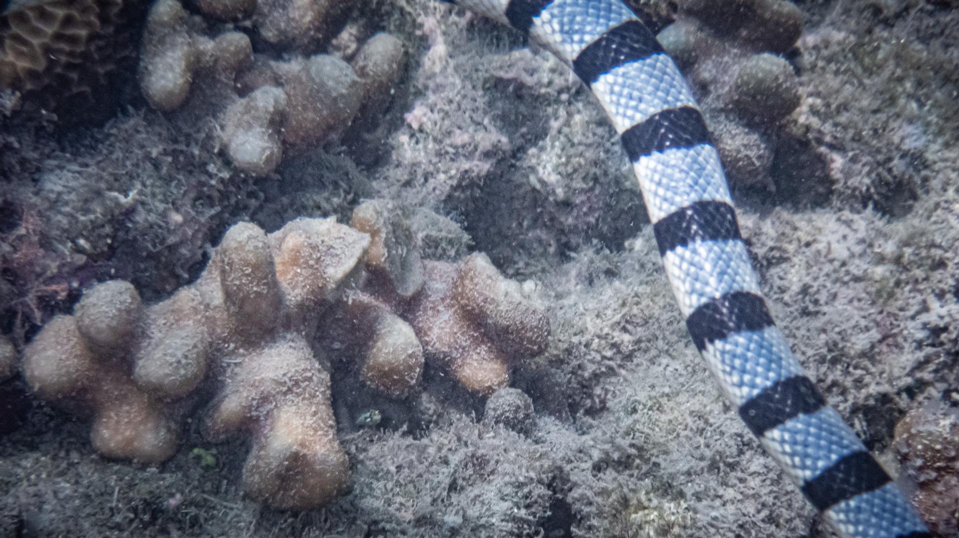 This sea snake was definitely not happy about Gez floating 1 foot above it, a bit of a close call, yellow-lipped banded sea kraits are quite venemous.