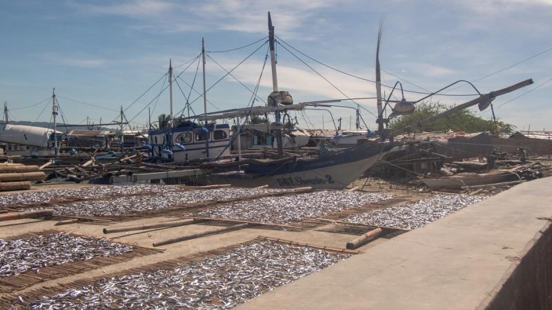 Having hung around baking in the shadeless port for a few hours, a very recently pregnant sniffer dog reluctantly sniffed some of the passengers’ luggage.
