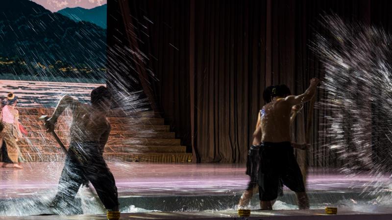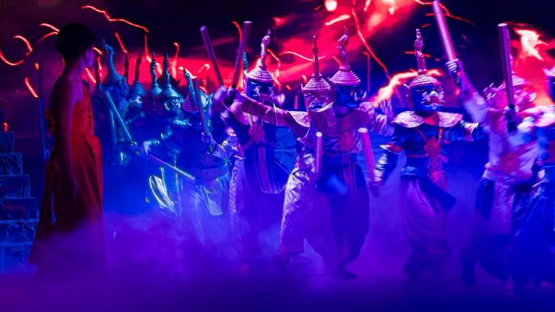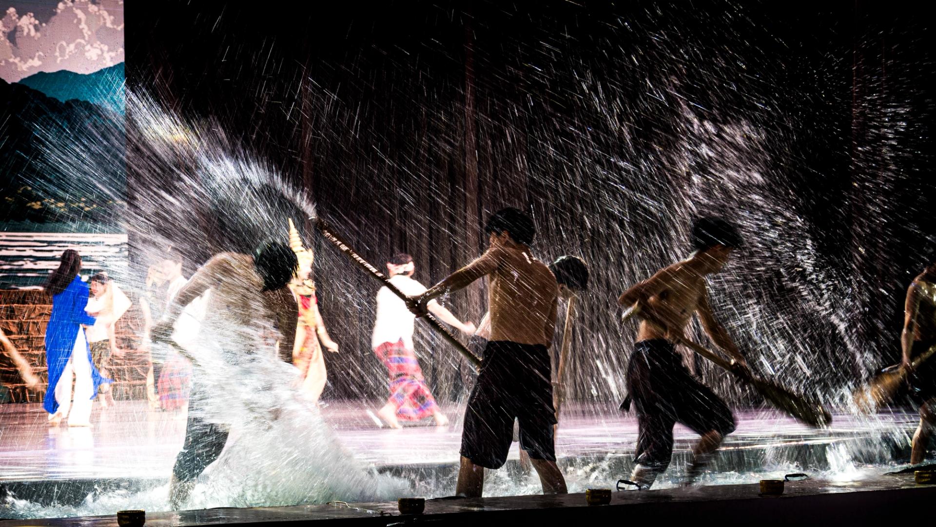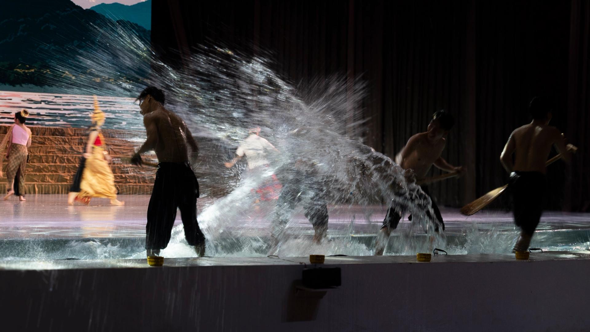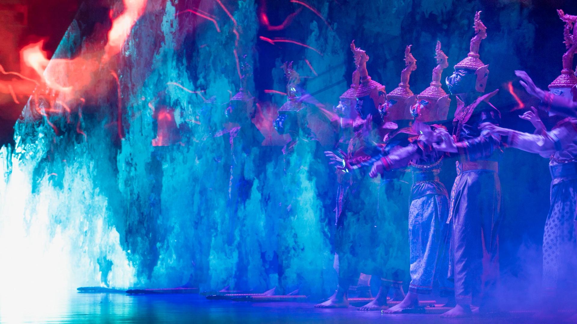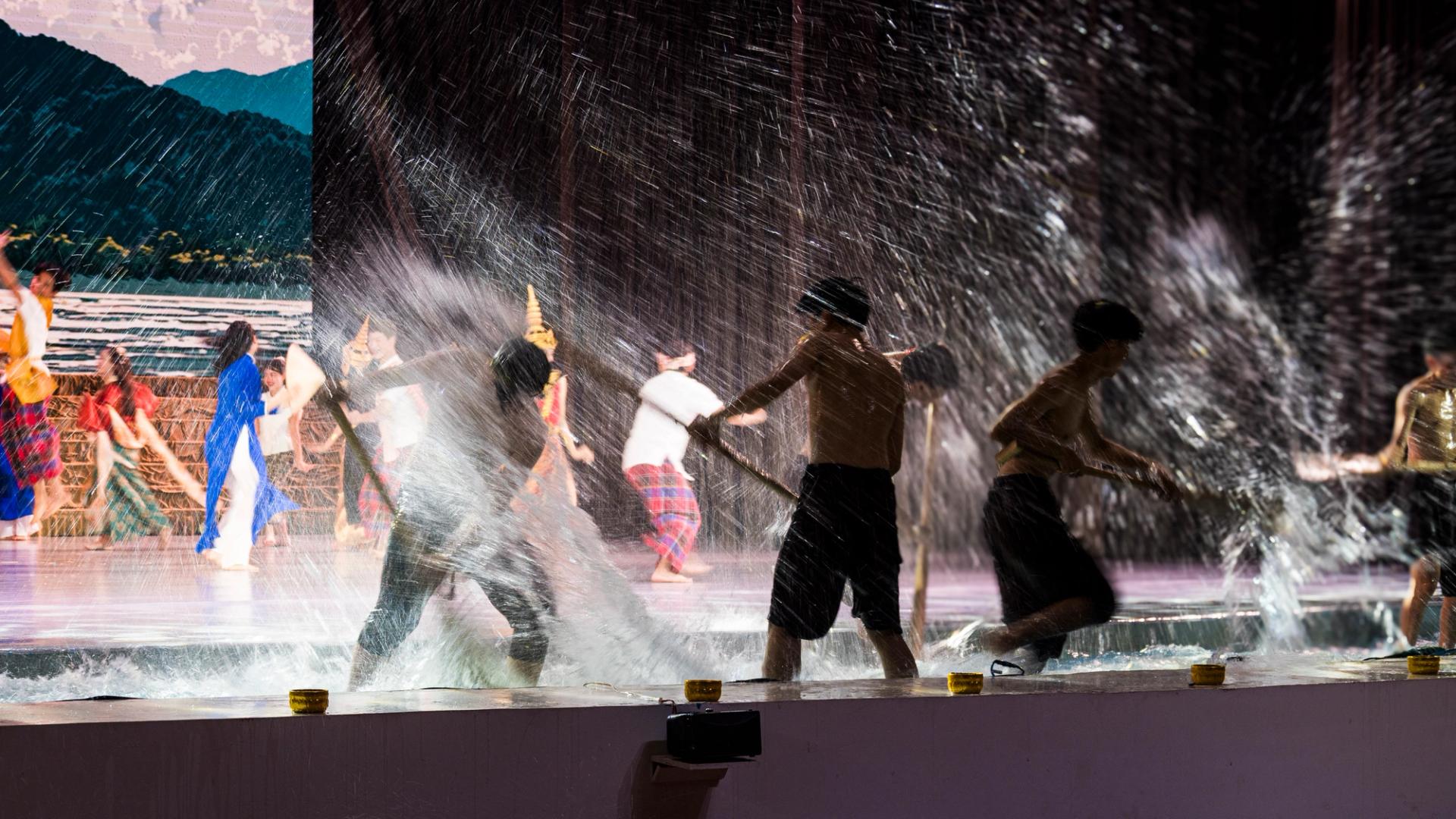Bhudda's light show is impressive and tech heavy - Intricate parallax scrolling animations projected on one or two transparent screens dropped from the ceiling between the audience and the performers, further projection mapping on the set and backdrop, lights, lasers and... a real moat filled with water at the front of the stage enabling monks in boats and a huge water fight mid-way through the performance.