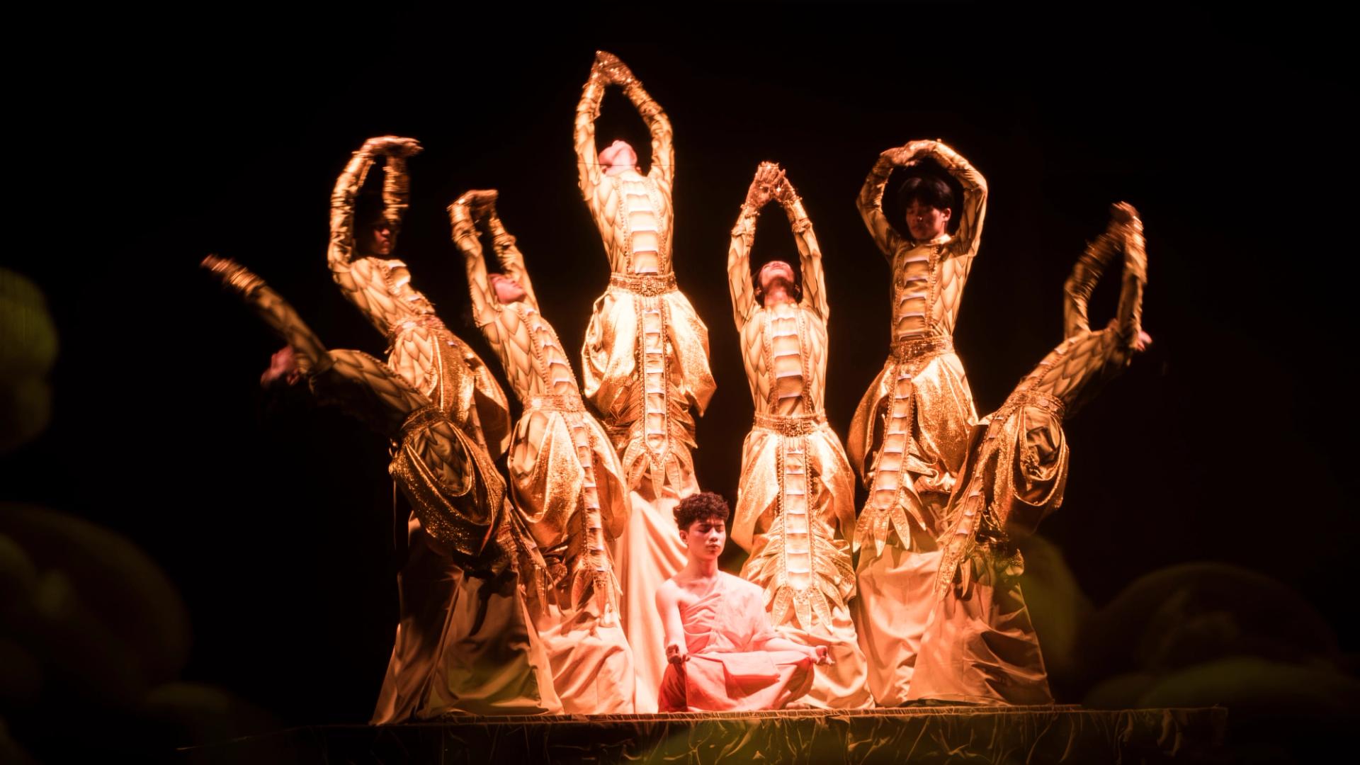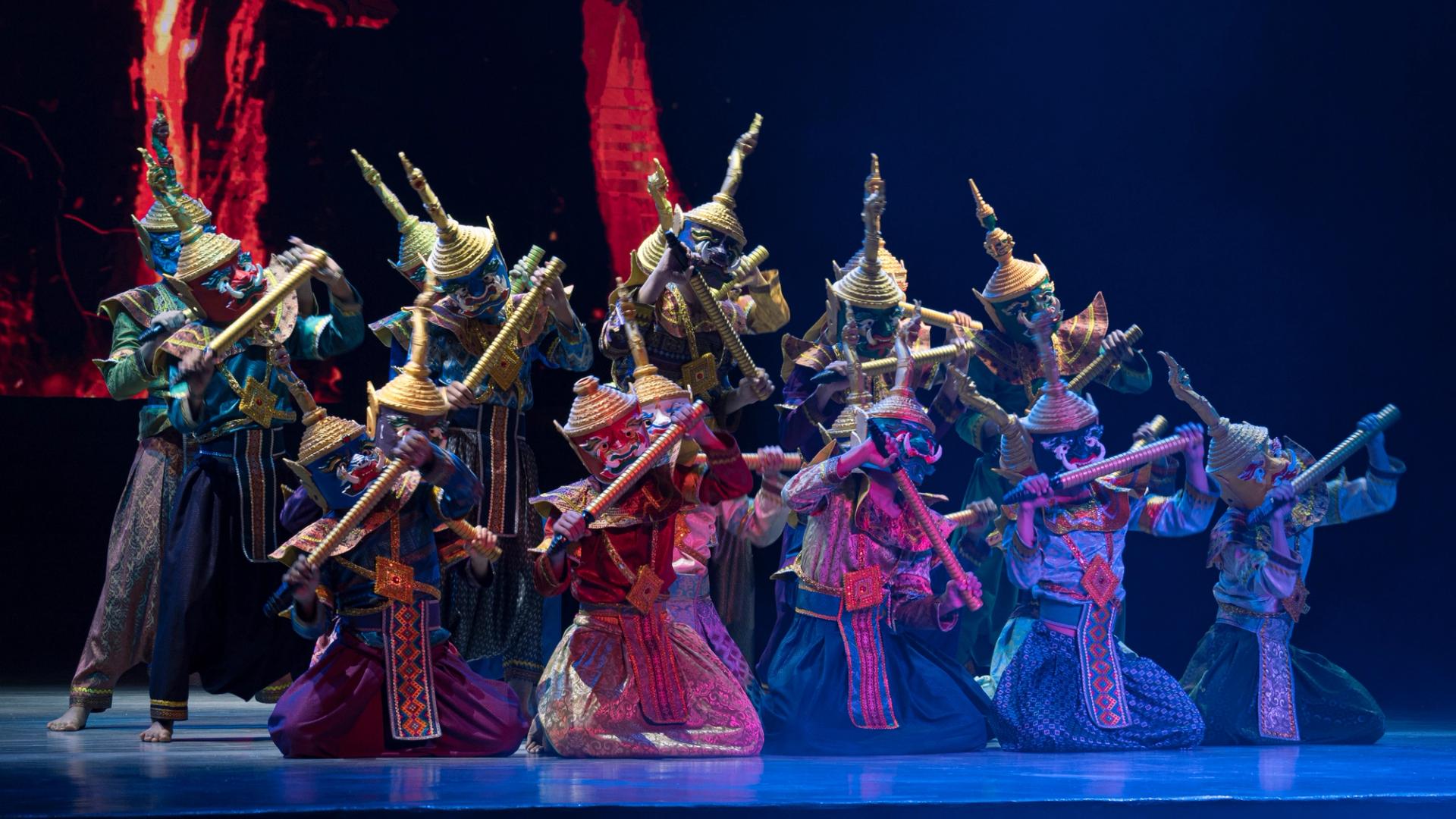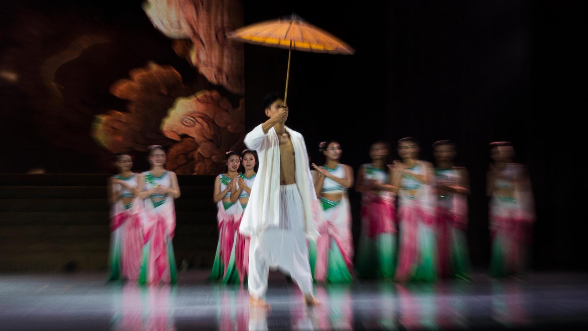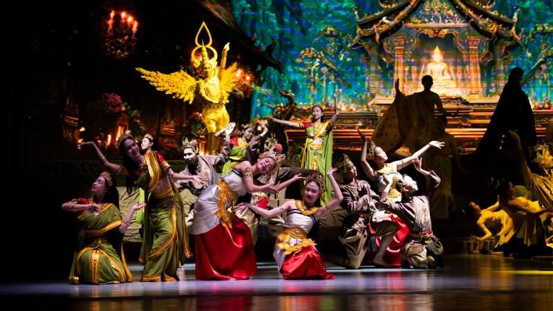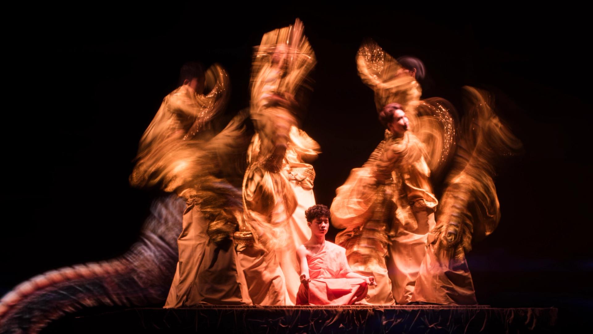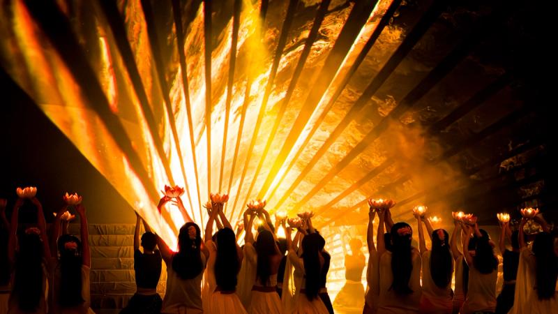 Bhudda's light show is impressive and tech heavy - Intricate parallax scrolling animations projected on one or two transparent screens dropped from the ceiling between the audience and the performers, further projection mapping on the set and backdrop, lights, lasers and... a real moat filled with water at the front of the stage enabling monks in boats and a huge water fight mid-way through the performance.