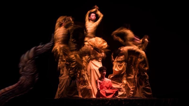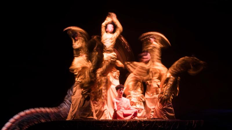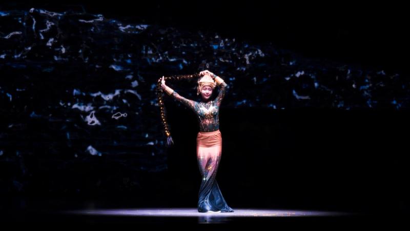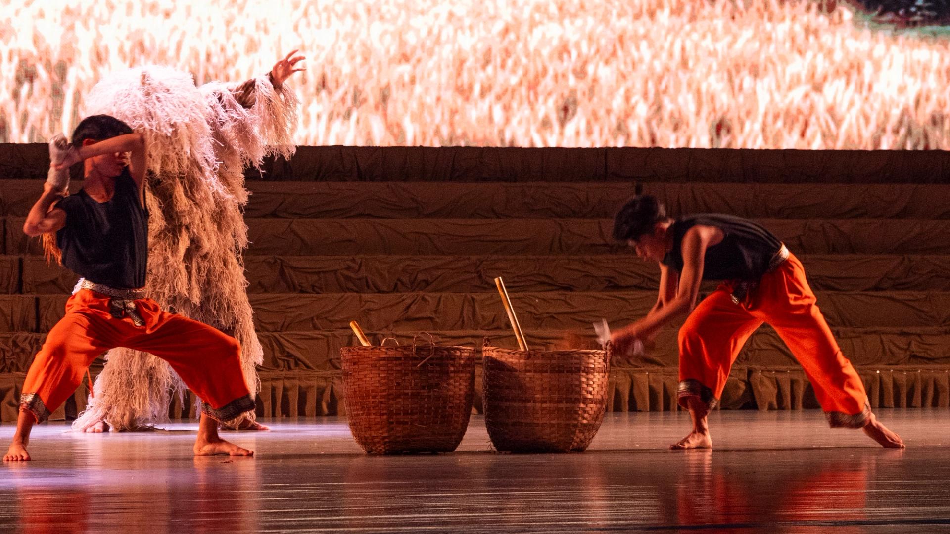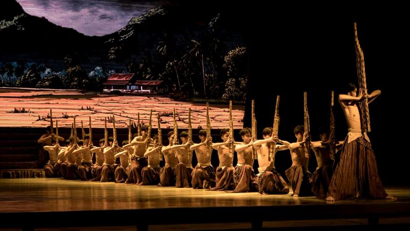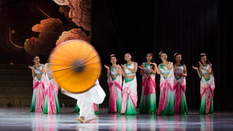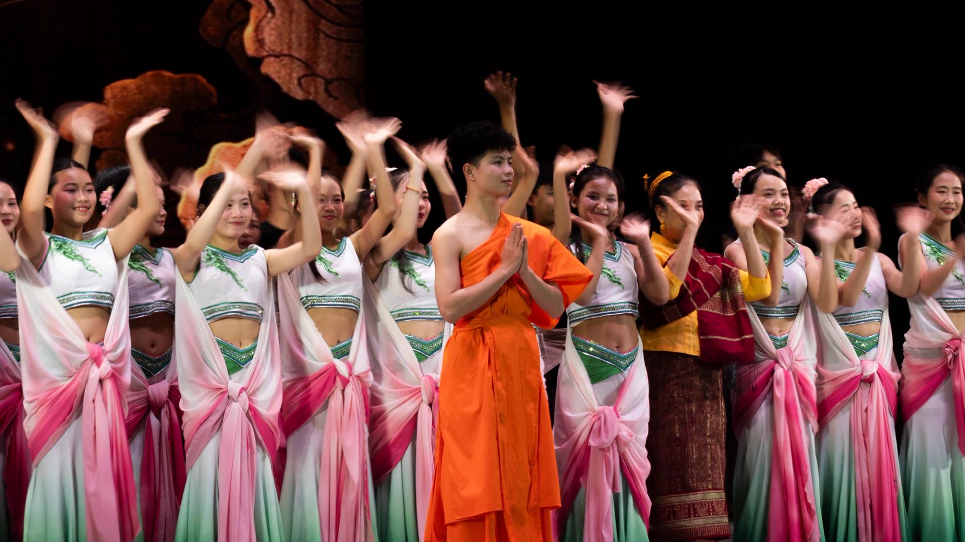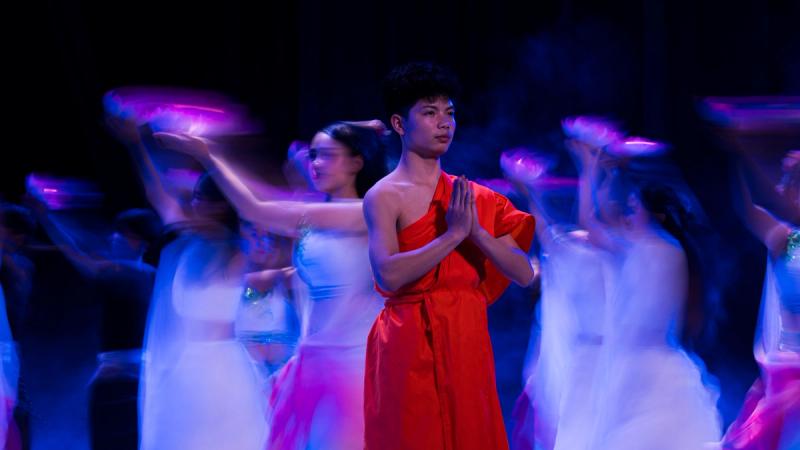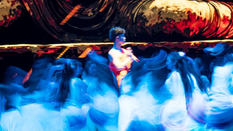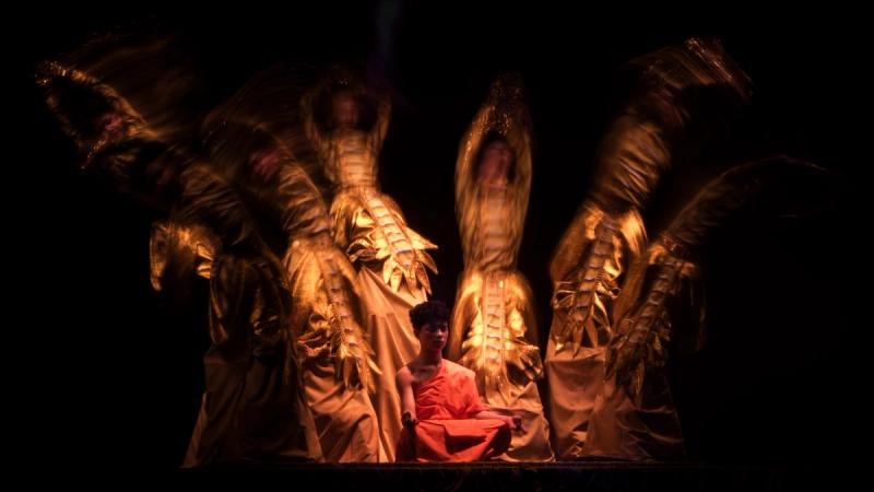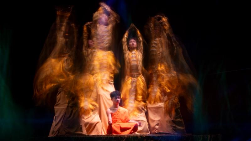 Bhudda's light show is impressive and tech heavy - Intricate parallax scrolling animations projected on one or two transparent screens dropped from the ceiling between the audience and the performers, further projection mapping on the set and backdrop, lights, lasers and... a real moat filled with water at the front of the stage enabling monks in boats and a huge water fight mid-way through the performance.