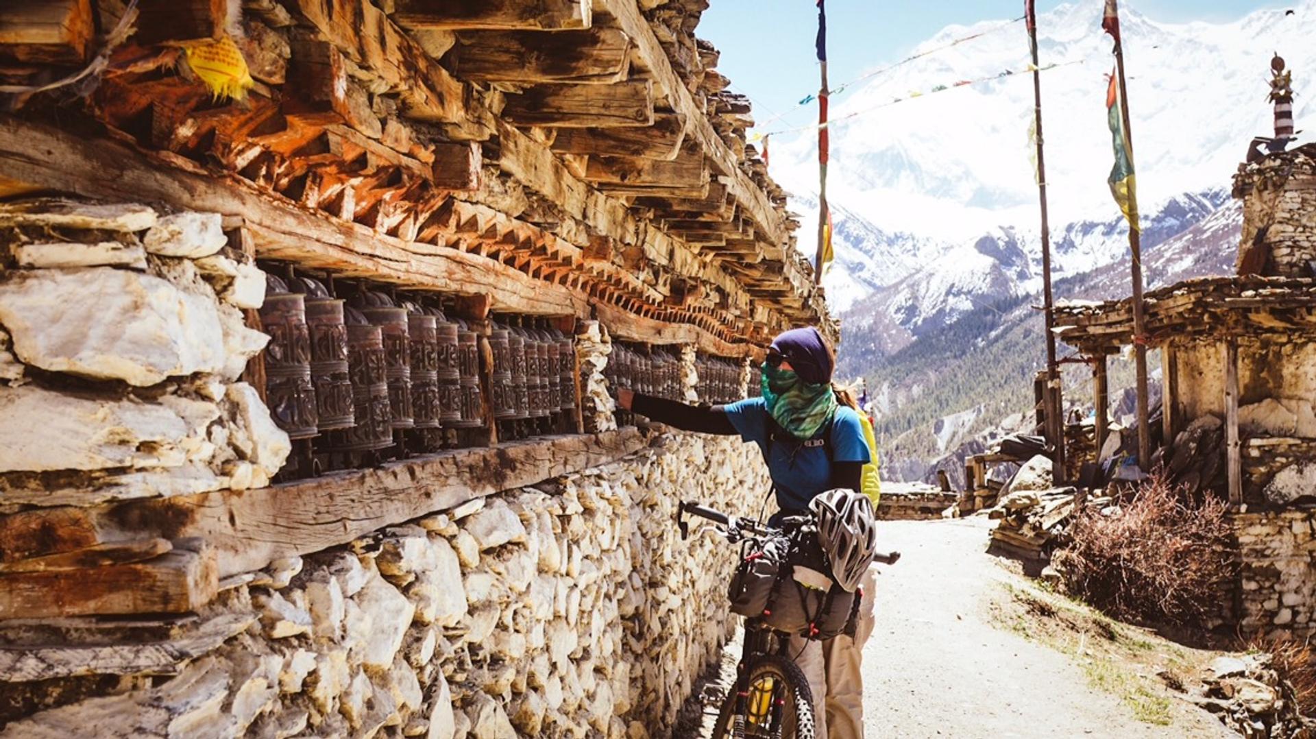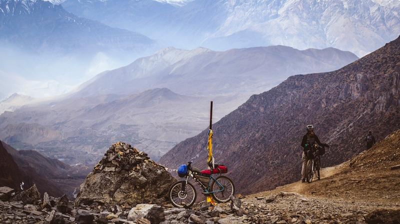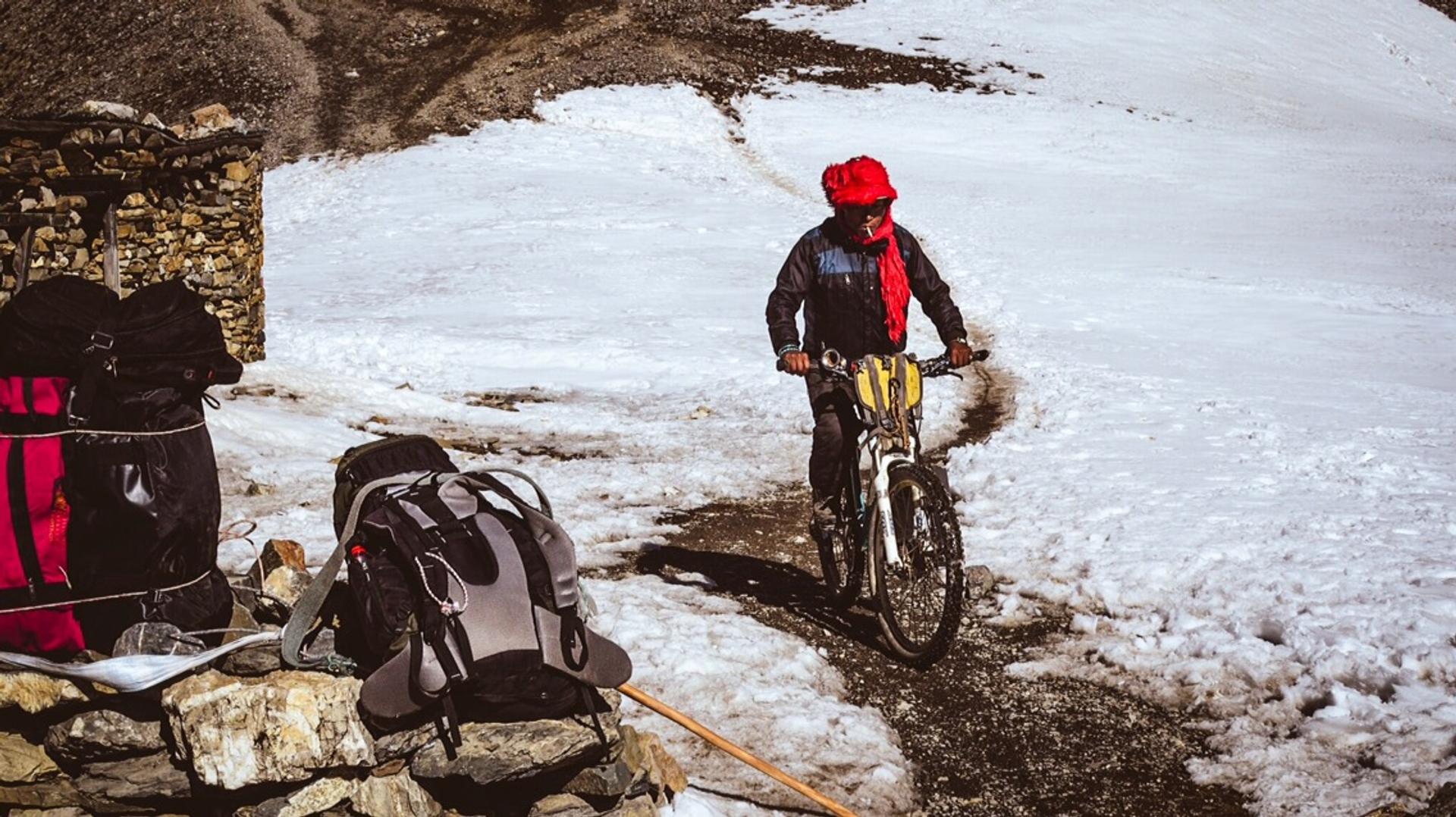 Less than an hour’s ride from Muktināth the wind becomes strong enough to blow us and the bikes back up hill and the snow starts to fall.