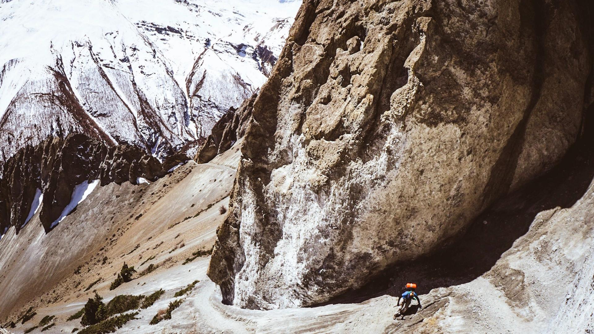 Fast-forward a bit and we’re crawling uphill on the rock-strewn dirt road that follows the Marsyangdi river gorge towards the high mountains. Huffing and puffing as our legs turn the pedals over and over for days on end, like two slightly wobbly locomotives in slow motion. The narrow track hugs the cliff face, towering on one side and falling away on the other. We’re gaining altitude, we’re making progress.