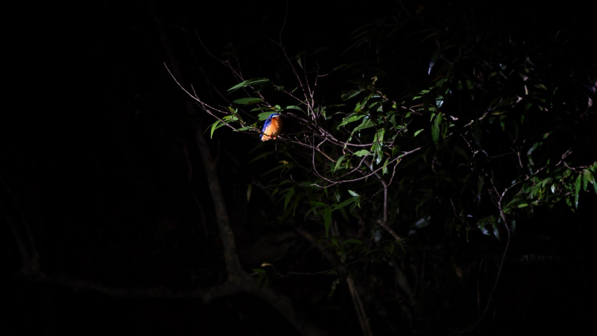 We spent many hours in a hide each sunrise and sunset for several days, only to spot some muntjac, deer and jungle peacocks. Our guided night safari has us loris spotting from a long tail boat, and while we can see eyes staring back at us from the riverbank it’s challenging to know exactly what we’ve spotted. (although judging by the size of one pair of eyes there was at least one loris, as well as a flying squirrel, and a kingfisher having a snooze).