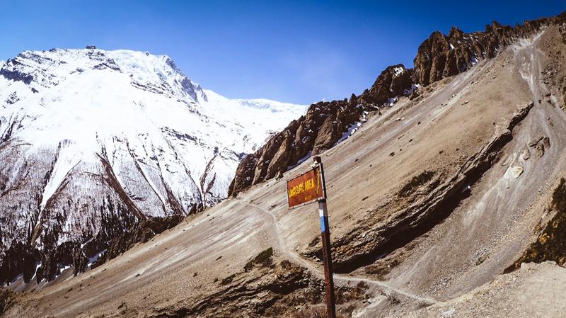 The thing about the mountains in this valley is that they are all constructed of the same basic material, so I should have realised what was coming. I think I was just hoping I was wrong. The landslides between base camp and the lake were even more fun than the ones we walked the previous day, thanks in part to the melting snow above us and the sheet ice on the path. Once we reached 4900m the whole thing became more fun than I knew what to do with, deep snow drifts, a false summit, fake lake and yet more sheet ice. The sign sticking out of the snow drift read 35mins to Tilicho Lake.